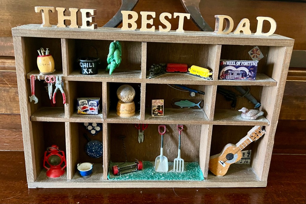Jack of all trades. Demigod of the garden. Camper extraordinaire. Master of music. Guru of games—rummy, poker, pool, and Wheel of Fortune. He roasted green chilis fresh off the vine, cooked up fresh-caught, deep-fried catfish, served hot chocolate gravy over biscuits for breakfast, and ran a locomotive to boot. A 7 x 10-inch shadowbox I made for his last Father’s Day captures his essence, his presence, in thirteen squares of assorted sizes.