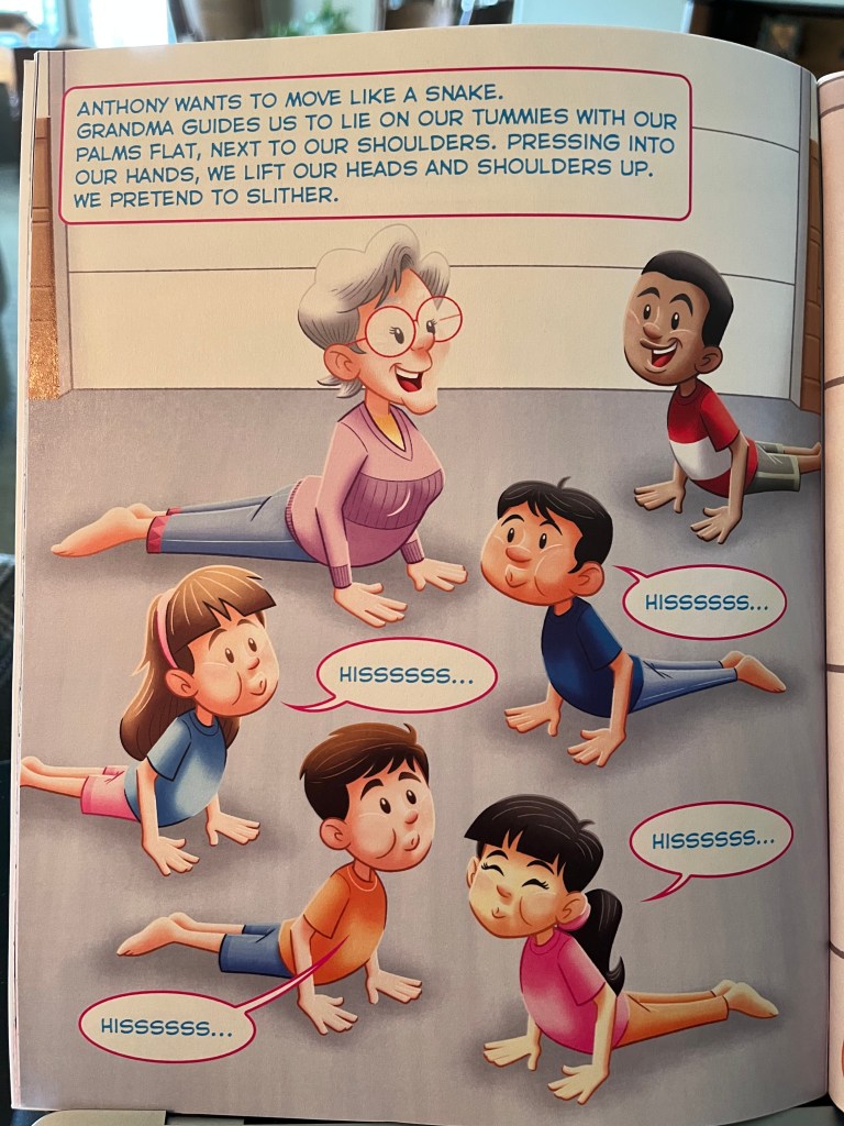I read Grandma Yogini to my own grandchildren during their visit, and they recalled the times we practiced yoga on my living room carpet. “What are your favorite parts of the Grandma Yogini book?” I asked. The littlest shouted, “Animals and poses!” The middle kid said, “Soccer!” The oldest thought about it and then listed them off, “Butterfly, Cat, Cobra, Eagle, and Kangaroo!”